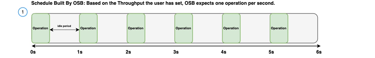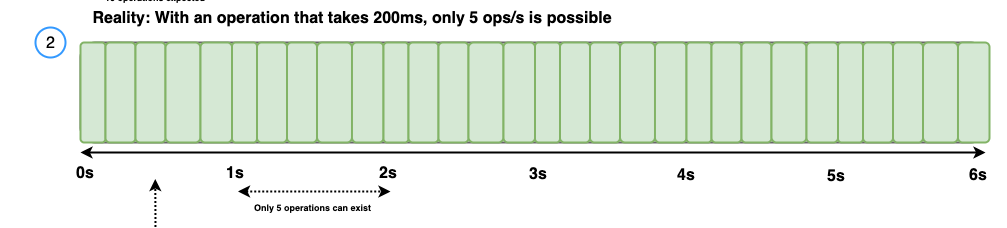 However, if it is assumed that all responses will have a latency of 200 ms, then 10 operations per second won’t be possible. Therefore, the highest throughput that OpenSearch Benchmark can reach is 5 operations per second, as shown in the following diagram.