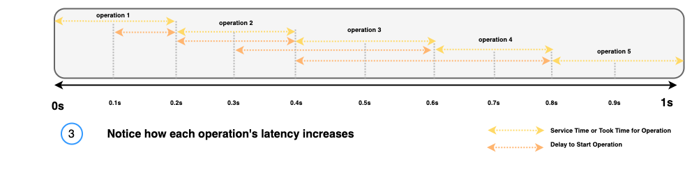 OpenSearch Benchmark does not account for this limitation and continues to try to achieve the target-throughput of 10 operations per second. Because of this, delays for each request begin to cascade, as illustrated in the following diagram.